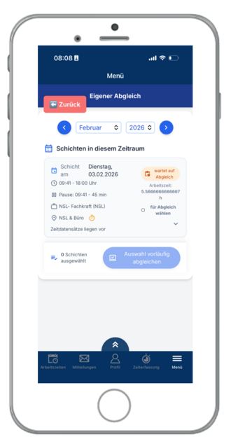 Sie haben hier die Möglichkeit Ihre Arbeitszeiten zu erfassen und vorläufig abzugleichen. Sollte Ihre Arbeitszeit von der geplanten Schicht abweichen, können Sie zusätzlich eine Bemerkung und die tatsächlichen Zeiten eintragen.